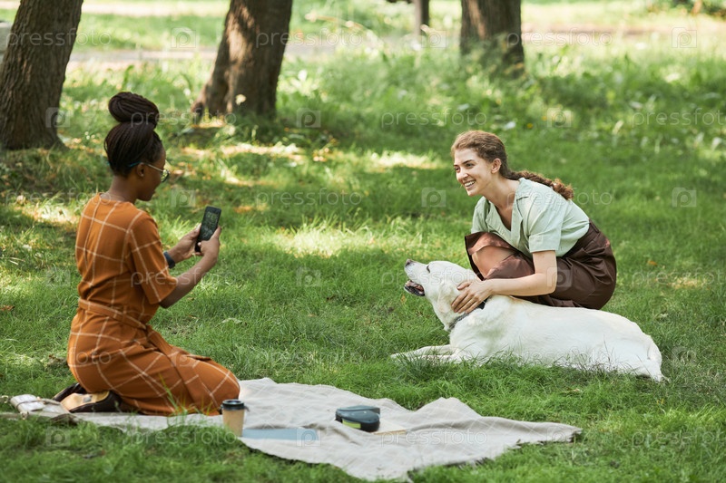 Молодые женщины с собакой в парке