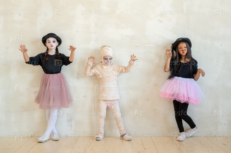 Три маленьких ребенка в костюмах Хэллоуина стоят у белой стены