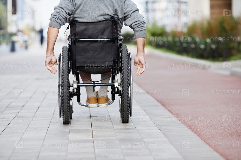Мужчина в инвалидной коляске катается на открытом воздухе