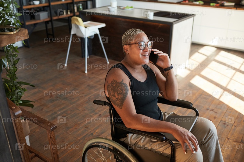 Улыбающаяся женщина с инвалидностью говорит по смартфону