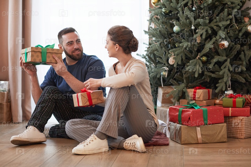 Пара распаковывает рождественские подарки
