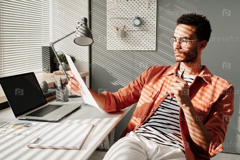 Сосредоточенный молодой афроамериканский менеджер со шлаком сидит за столом против жалюзи и рассматривает документы