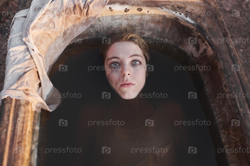 Печальная женщина, лежащая в грязной ванне