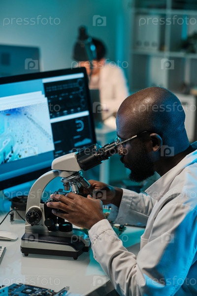 Молодой человек африканской этнической принадлежности сидит на рабочем месте и смотрит в микроскоп