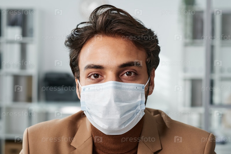 Портрет красивого молодого менеджера с Ближнего Востока в маске, сидящего в современном офисе