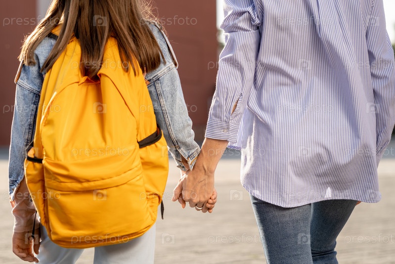 Задний вид матери и дочери, держащихся за руки во время движения к школе