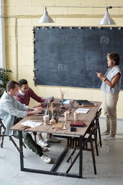 Два коллеги-мужчины, взаимодействующие за столом против женской коллеги