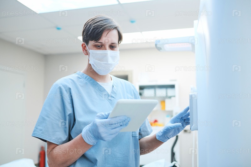 Концентрированная медсестра в маске и перчатках стоит с планшетом и запускает МРТ-сканер на клинике