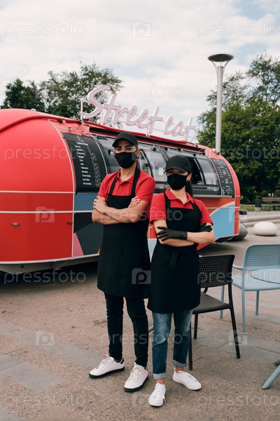Два молодых владельца малого бизнеса в защитных масках