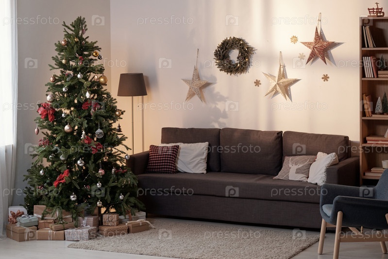 Просторная домашняя комната с диваном, лампой, креслом и рождественской елкой