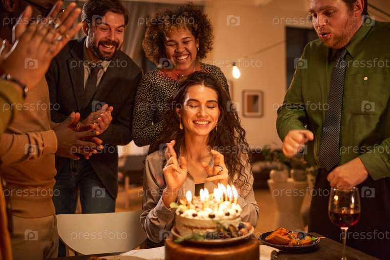 Женщина загадывает желание перед тем, как погасить свечи на торте