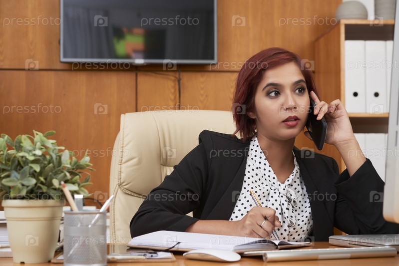 Серьезная деловая женщина, разговаривающая по телефону