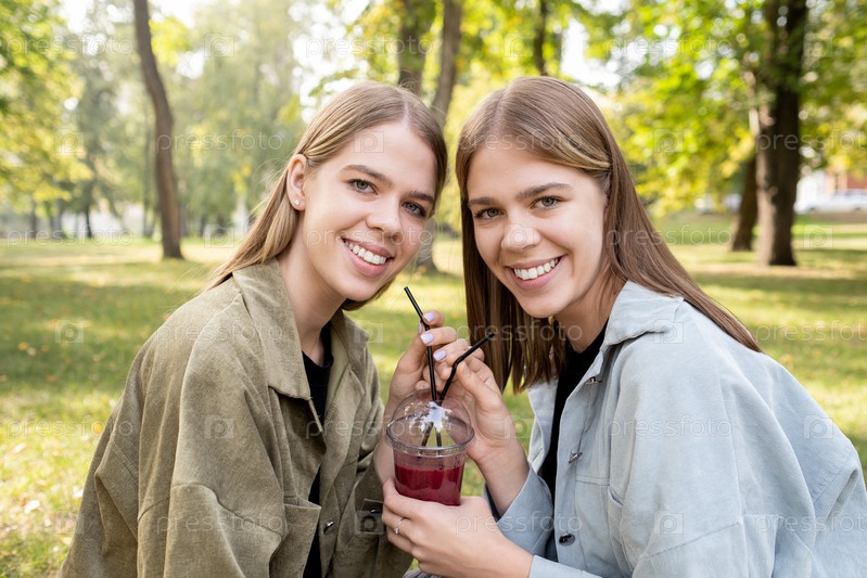 Две веселые милые девочки с соломинками, держащие большой стакан свежего смузи