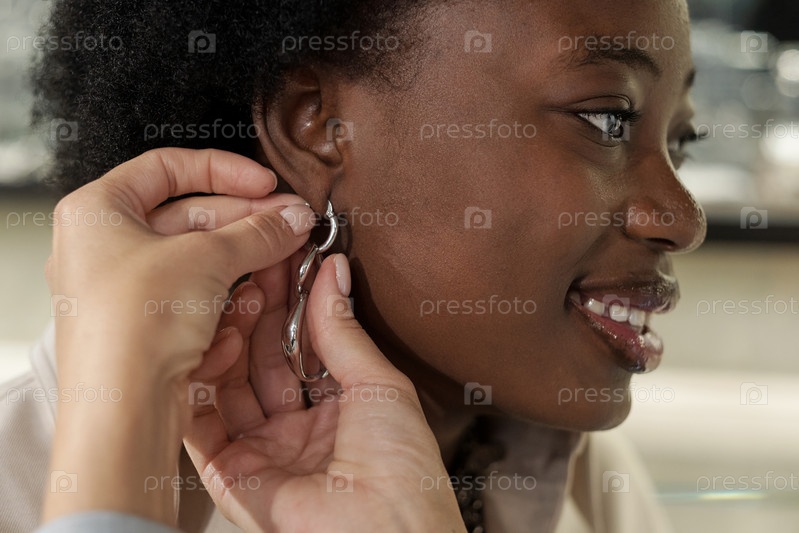 Счастливая молодая африканская женщина, пробующая новые серьги
