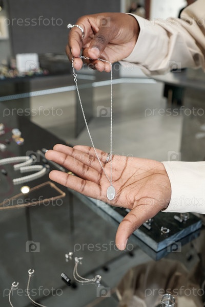 Руки молодой африканской женщины, показывающие серебряную цепочку с подвесками