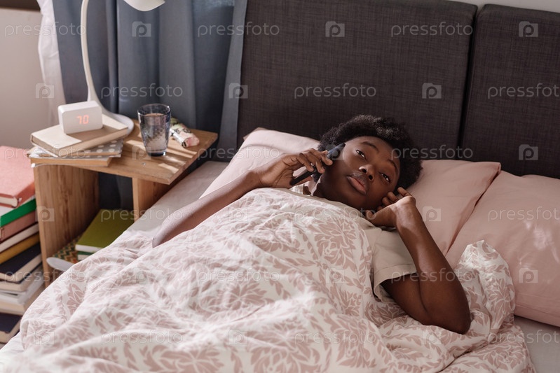 Женщина, разговаривающая по телефону в спальне