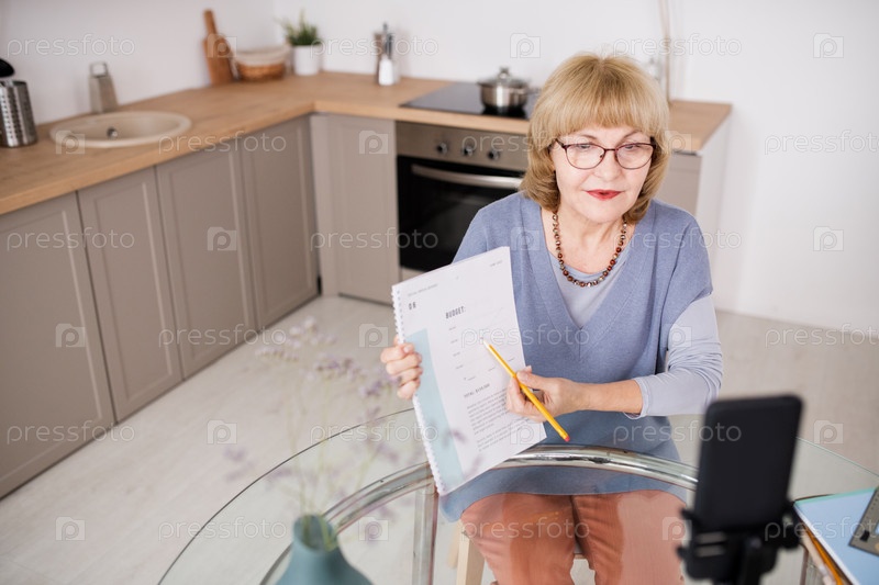 Уверенная в себе взрослая учительница показывает на бумагу во время прямой трансляции