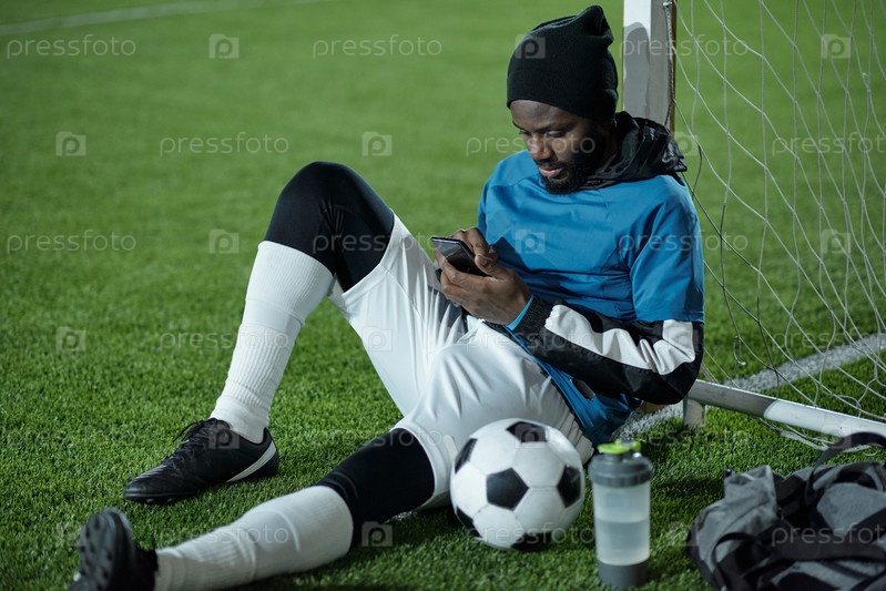 Молодой спокойный спортсмен прокручивает смартфон после тренировки