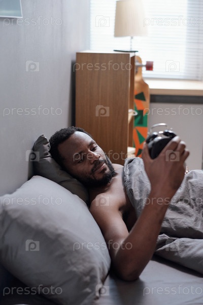 Молодой бородатый мужчина лежит под одеялом в постели и смотрит на циферблат часов