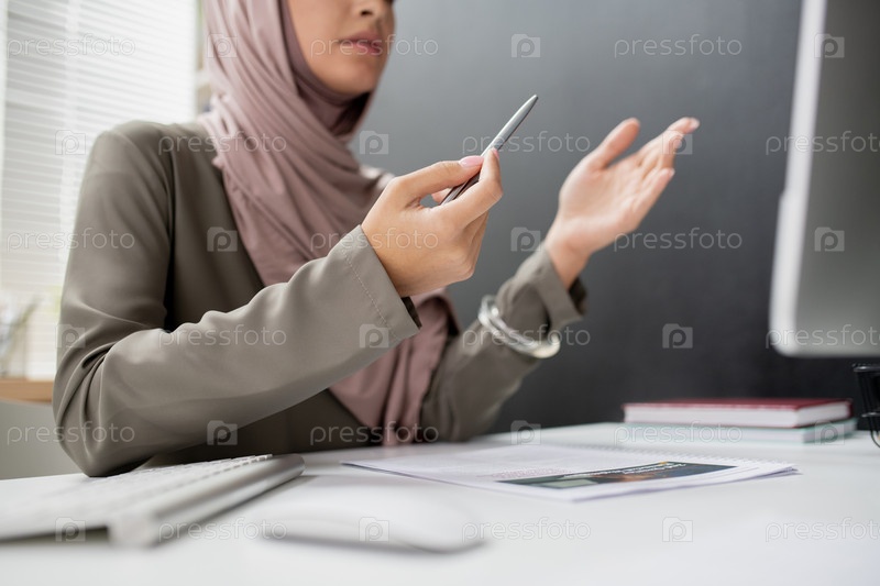 Руки молодой учительницы в хиджабе, объясняющей что-то перед компьютером