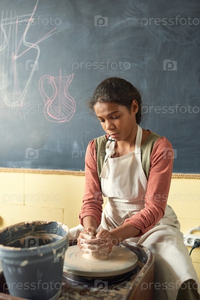 Красивая африканская школьница сидит у вращающегося керамического колеса