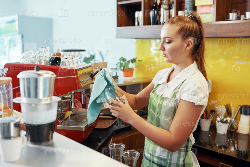 Бариста, стирающая стеклянные вазы
