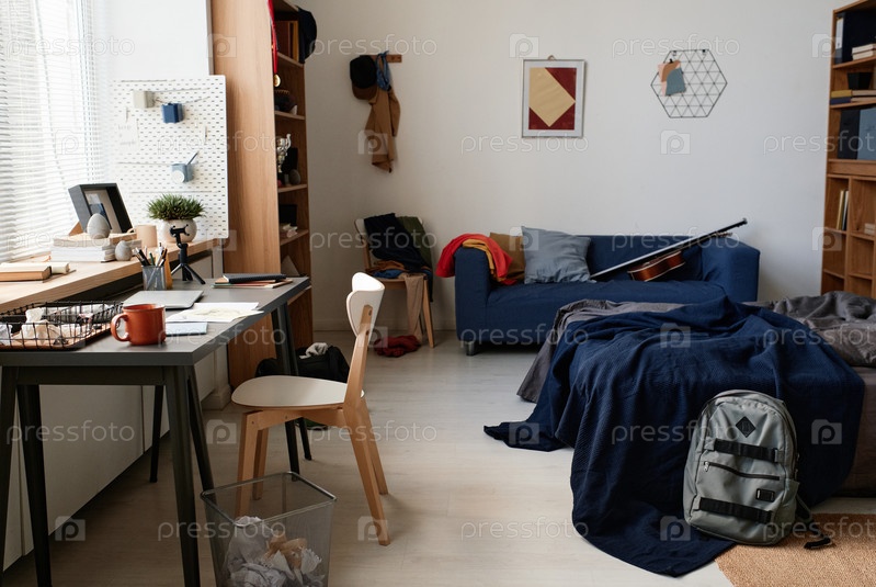 Хаос в студенческой комнате: незаготовленная кровать, гитара на диване, одежда на стуле и бумаги на столе