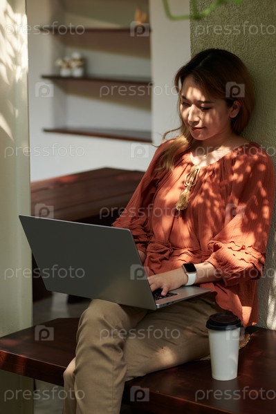 Улыбающаяся женщина работает на ноутбуке