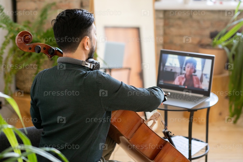 Задний вид молодого учителя музыки, играющего на виолончели перед ноутбуком