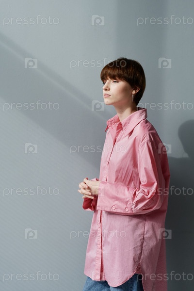Вдумчивая молодая женщина в большой розовой рубашке стоит с зажатыми руками на сером фоне