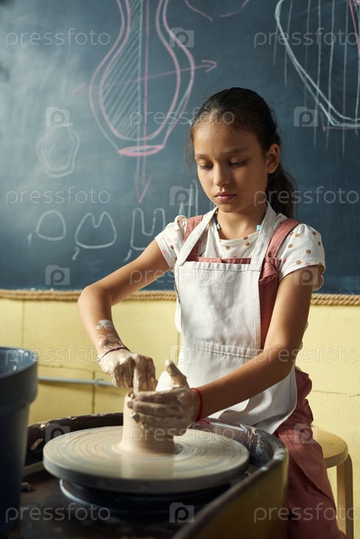 Современная школьница сидит у вращающегося керамического колеса