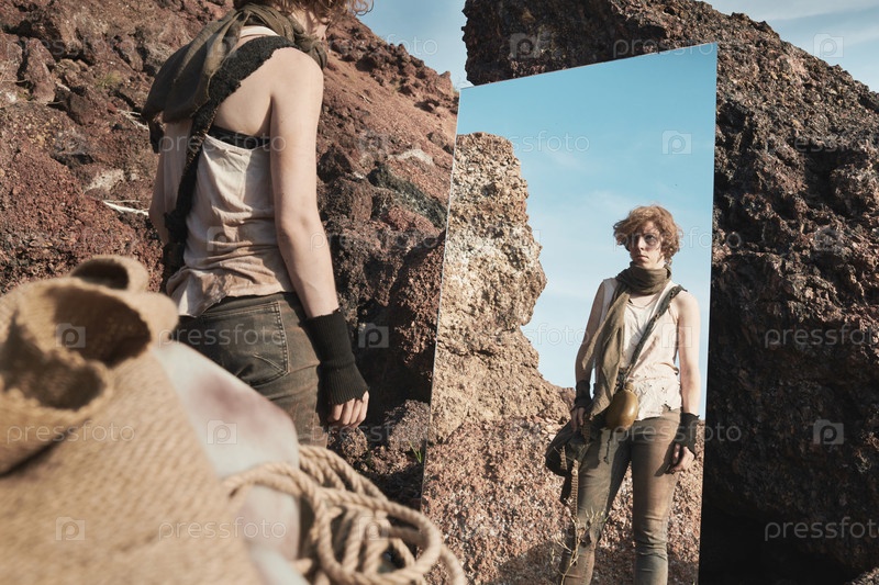 Женщина смотрит на себя в зеркало