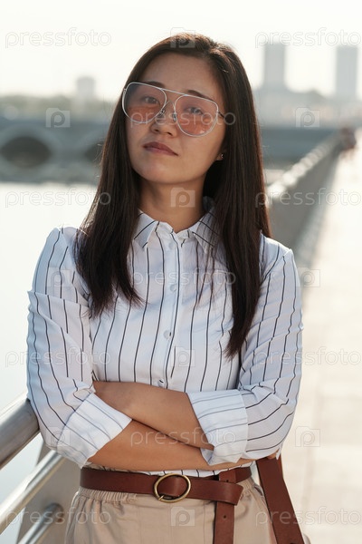 Уверенная в себе молодая деловая женщина в полосатой рубашке и бежевой юбке