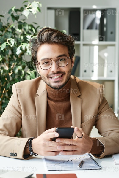 Портрет веселого молодого менеджера из Ближнего Востока в очках и браслетах, сидящего со смартфоном за столом в офисе