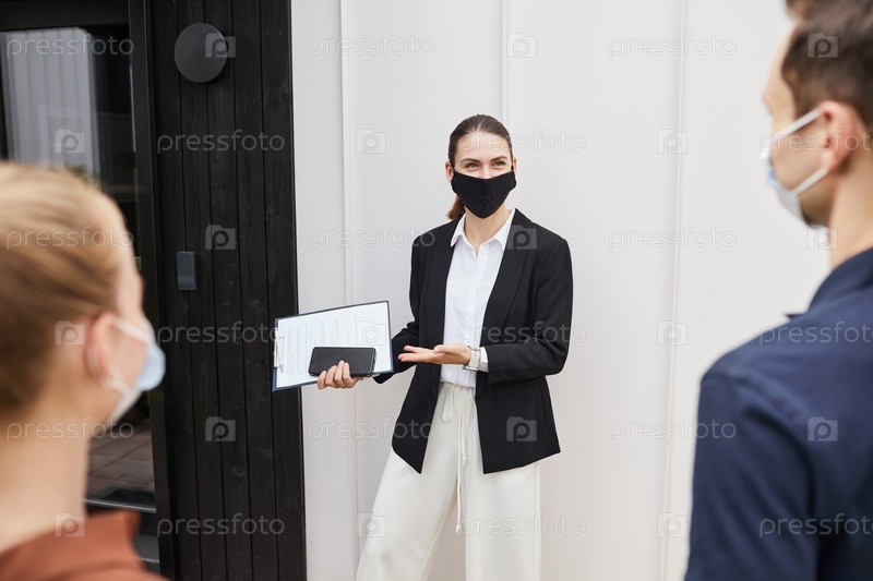 Агент по недвижимости, носящий маску во время тура по недвижимому имуществу