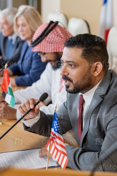 Уверенный зрелый бизнесмен, говорящий в микрофоне