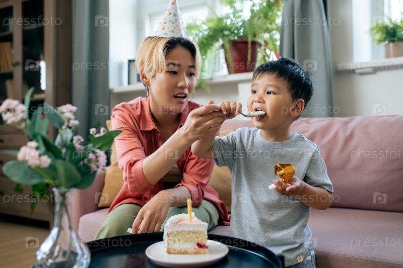 Молодая мать кладет ложку с вкусным тортом в рот своему маленькому сыну