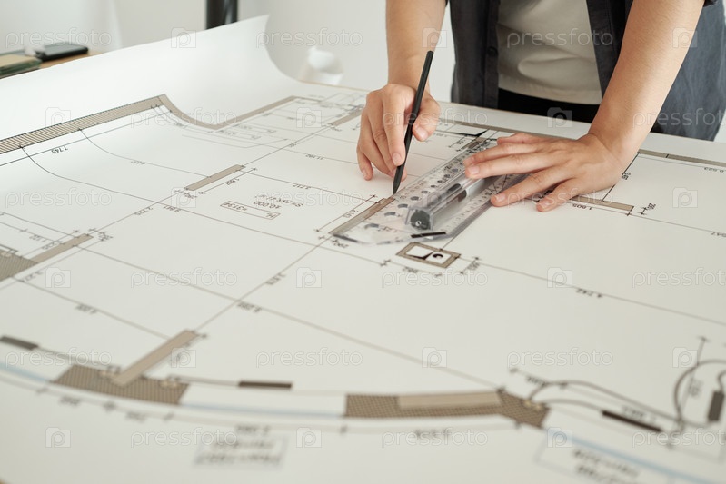 Руки молодой женщины-инженера с линейкой и карандашом над чертежом
