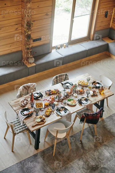 Сервируется праздничный стол с кухонной утварью, домашней едой и украшениями
