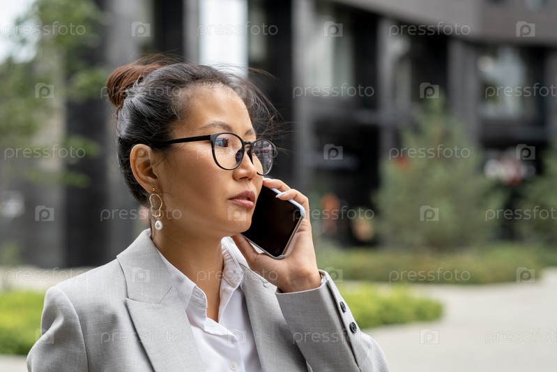 Молодая серьезная азиатская бизнес-леди звонит деловому партнеру