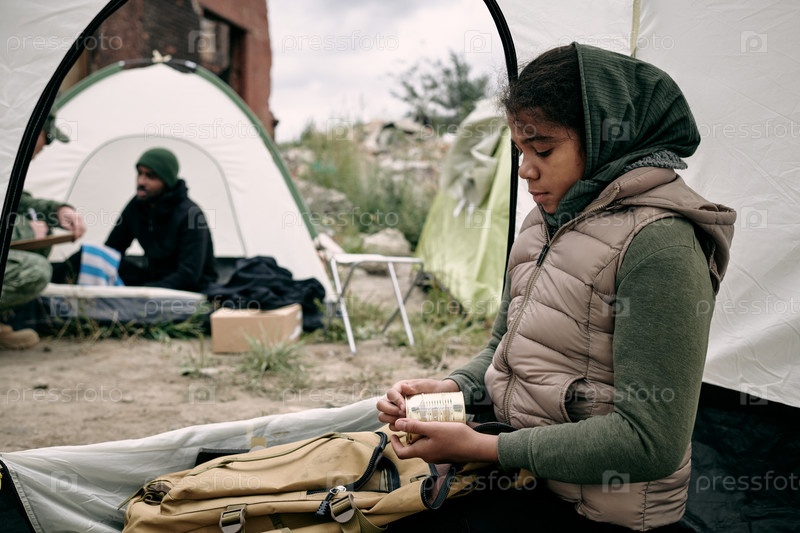 Голодная африканская девочка держит консервы, сидя в палатке
