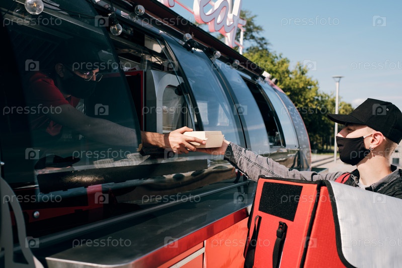 Молодой служащий в защитной маске передает упакованное питание курьеру службы доставки