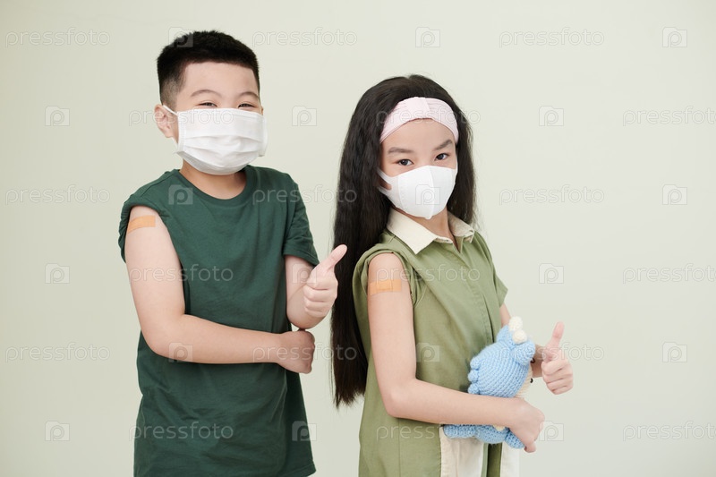 Вакцинированные дети показывают палец вверх