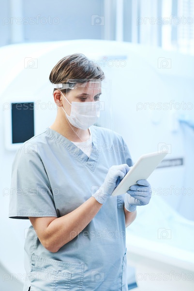 Загруженный молодой технолог по МРТ в защитном лицевом щите и перчатках с помощью планшета, анализируя онлайн КТ-сканирование ковидного пациента