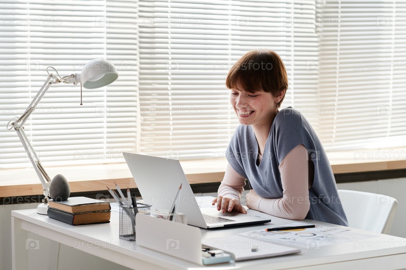 Позитивная молодая женщина в обычном жилете сидит за столом с лампой и наслаждается офисной работой
