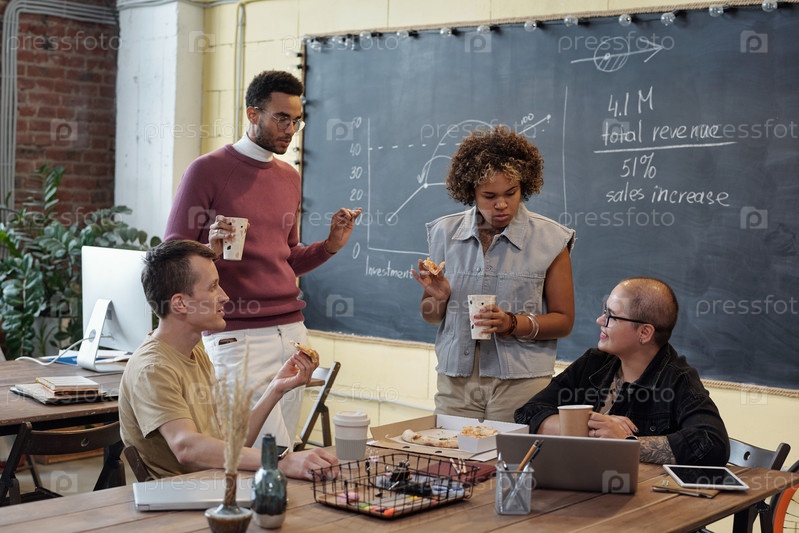 Группа молодых современных коллег за пиццей и напитками