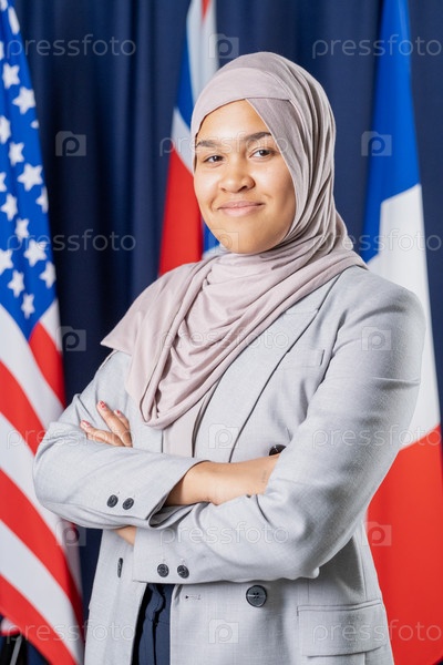 Молодая хорошо одетая мусульманка-политик в хиджабе и элегантном костюме