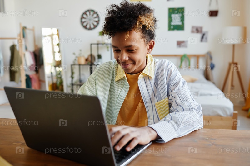 Улыбающийся подросток использует ноутбук