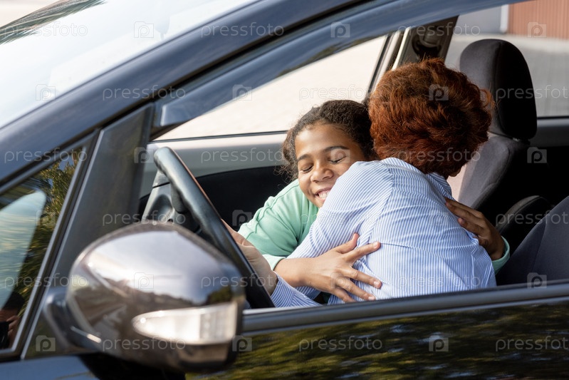 Счастливая школьница обнимает свою маму, пока оба сидят в машине