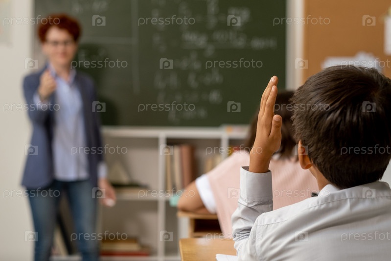 Задний вид школьника, поднимающего руку, чтобы ответить на вопрос учителя